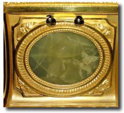 Louis XVI. For those of you who have the 1975 edition of La Pendule Francaise, you will find several examples similar to this on pages 288-291. The lever movement is in the base and power is transmitted up through the urn to the annular dials. This example has panels of green onyx in both the oval and rectangular "windows" in the base. Winding is accomplished from the rear of the clock, via two beveled gears that mesh with the vertical winding arbors. Strikes the hours and halved on a bell. The well jeweled lever platform is intact and the clock is in running order. The case retains its original fire gilding, and the time is indicated by the tongue of a bronze serpent who has coiled around the urn. Height 17 inches