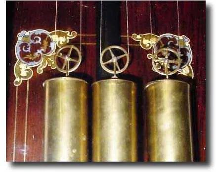 clock in very good original condition. The case back, door, bracket and top trim are profusely inlaid with pewter, brass and rosewood on ivory fields. The twisty columns are reminiscent of styles 2 centuries earlier and very well executed. Most remarkable is the dial which is a flat porcelain field with 12 individual cartouche numerals, each on a copper shield, the copper dial center with a floral pattern, and the cast bezel with a floral pattern I have not seen before, all accented by a delicate set of finely pierced hands. The 4 spoke pulleys are also sharp and well made. Now there are some repairs to the inlay here and there, but only noticeable on close inspection and we would still class this as overall very good condition. Height 48 inches