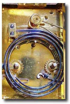 This clock came from a collection in Chatham and shows signs of good care. Glass and porcelain dial are all nice. Strikes the hours only on the hour, and ding-dong quarters every 15 minutes, repeats the hour and quarter on demand. The case has been polished and lacquered and clock retains original silvered platform intact. Height 7 inches