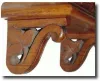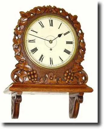This is a mahogany carved case, grapes and grape leaves all around, and with a built in bracket base with hinged door under the shelf for access to the pendulum. The heavy plate fusee movement has straight pillars commensurate with this time period. The dial has a little roughness where the pillar posts are attached. The hands are original. There is an access door on the side of case (besides the one on the bottom). The latch on the bezel needs repair. (The part is there, old solder repair failed). Height 17 inches