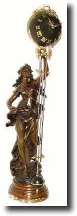C.1890, French, Bronzed Spelter Swinging Mystery timepiece (swinger), in excellent condition, the statue with original patina (some touch-up), the ball professionally refinished to forest green, and the movement cleaned. This large statue of Brise d`Automne (Autumn Breeze), is one of the most popular French creations, and is signed Moreau on both the statue and the little brass plaque on the base. An exceptional example, ready to enjoy, running well. The ball is 6 inches in diameter; overall height 38 inches