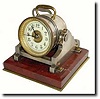 clocks. This clock may be seen in Derek Roberts' Mystery, Novelty and Fantasy Clocks, page 258, top of page. The clock is wound from behind after removing the rear cover. The movement has a replaced cylinder platform from another clock, and although fully wound only runs for a few minutes, so will need attention. This is a heavy little desk clock, the cannon supports machined from brass and then nickeled, the whole mounted to a red marble base with a bronze sill piece. Height 4 inches