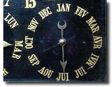 C.1900, French Calendar Clock, 8-day. This is an interesting clock that we have not seen before, a simple calendar around the chapter ring, day dial lower left and month dial lower right. The rectangular plate movement raises a bar once a day to advance the date and day. The month must be advanced by hand, and of course short months must be corrected by hand. Runs but calendar needs adjustment. Nice original dial is gold paint stenciled on black wooden dial plate. Base molding has been broken and glued. Neat item. Height 12 inches