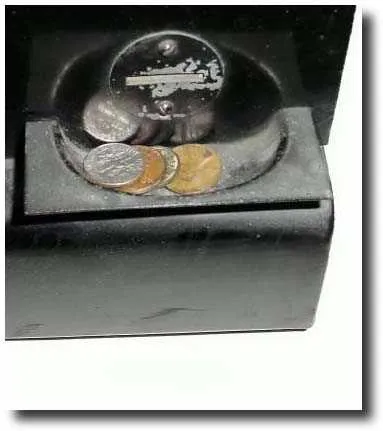 A slot in the top accepts a US nickel. The minimum payout is one cent or one token, some of which are marked "worth 5 cents in trade". Every eighth pa...
