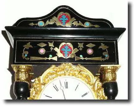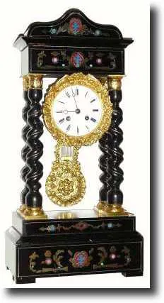 twisty columns and brass and enamel inlay. This clock has been nicely restored, and the brass work has been re-gilded. There is a repair to the porcelain dial by the left winding hole. The dial is signed by a Paris retailer, and the movement is stamped with the name Barbot. You may need to make a new nut for the bell, as the one there is a bit hard to get off in order to hang the pendulum; otherwise everything seems fine, running and striking. Height 20 inches