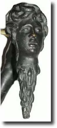 head of his decapitated Medusa (all with great detail). According to Greek mythology, Perseus presented the head to Athena, goddess of wisdom and war. A brass support has been screwed on to Perseus' arm to hold a swing clock. The blade of his sword is missing, however the hilt is there and it should be no trouble to add a blade. The statue is mounted on a stepped dark green marble base (some minor chips) with ormolu feet and the combination is quite heavy. Rear feet on base have been soldered. Use as a swing statue or restore as an impressive (albeit gruesome) bronze. Height 30 inches There is no reserve on this but feel it must be worth at least