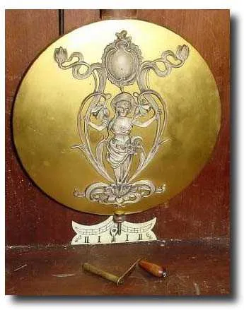 a 2nd Baroque case and in good original condition. The exceptional things about this clock are the original Art Nouveau embossed and silvered decorations on the dial center, weights and pendulum. The original movement strikes the hours and quarters on straight steel rods, with a very mellow tone. The walnut case has a single door separated by a molding to give the appearance of a double door. The are a couple of splits in the veneer (only noticeable on close exam), and minor nicks and scrapes. Will clean up to a clock you can be proud of. Height 51 inches