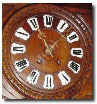 of these models in the sale. At some point in its life the original movement got separated and a good clockmaker found one that bolted in correctly, except that the winding arbors were a little farther apart. So the wooden dial had to be plugged and 2 new holes drilled. This was done some time ago, and very well stained, but it is apparent on close inspection; one tapered glue block missing from right side. So we leave it to you, the average person would never see these and it will certainly add to anyone's decor. Height 38 inches