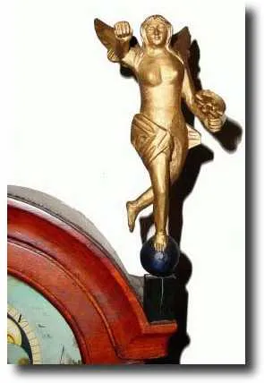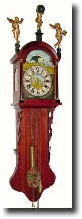 or even 'hood' clock in America. The Dutch are very proud of their heritage, and as the originals of these got scarce in the 1990s they began to produce them again, in the original size with full length meter pendulum, the movements copies in every respect of the originals. This particular clock even has a rolling moon and a weight alarm that works. This is a 30 hour clock like the originals. The bottom "tail" comes off for pendulum adjustment and is held on by 2 tabs. These sell in Holland for around $600 today, and I would imagine it should be around the same here. Note one angel's wing is missing. Height 58 inches