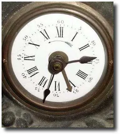 pushing a wheelbarrow containing garden vegetables, but notably a large squash which contains a 30 hour alarm clock. The case is in generally good original condition, whatever finish it had is oxidized to a dark color, and one simple wire support missing from front. We sold a cousin to this clock in April '99, lot 426 for nearly $1000, however it had a colorful paint scheme; ticks and alarms. Some hairlines in porcelain dial. Height 10 inches