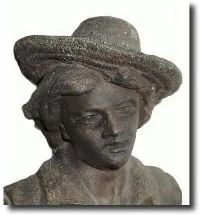 C.1900, French, A spelter novelty of a young farmer pushing a wheelbarrow containing garden vegetables, but notably a large squash which contains a 30 hour alarm clock. The case is in generally good original condition, whatever finish it had is oxidized to a dark color, and one simple wire support missing from front. We sold a cousin to this clock in April '99, lot 426 for nearly $1000, however it had a colorful paint scheme; ticks and alarms. Some hairlines in porcelain dial. Height 10 inches