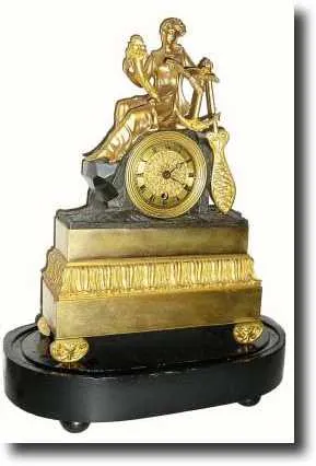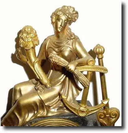 C.1830, French, Ormolu and Bronze figural clock of HARVEST, in good original condition. It comes with a wooden base, but no dome. Harvest holds wheat in here left hand and a large blossom in her right hand, and resting her arm on an anchor, and an oar with fish scales leaning against the 'rock' on which she sits. The well made silk thread movement does tick, but has been standing in the open for a long while and will need cleaning. A very attractive clock. Note blossom attaches with a screw that has come loose. Height of clock, 11 inches, total with base 13 inches
