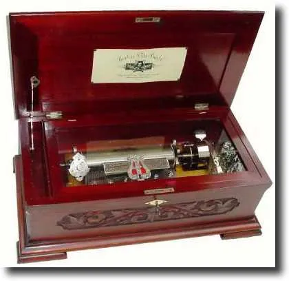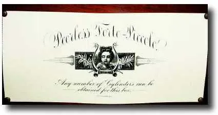 cylinder only). This is a Peerless Forte-Piccolo Box with wonderful tone and crisp tunes. The original tune card for the one cylinder is present. The movement is nickel plated and includes Jacot's safety device, tune indicator, zither attachment and a let-down feature. The solid mahogany case has a carved front and inset panel top, and retains orginal lock and key. This box is a joy to listen to, cleaned and in good operating order. Cyl 9 inches, wide 24 inches, Height 8 inches .