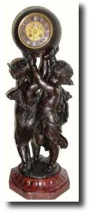 C.1890, French, Large Figural Clock, of two young children holding a globe aloft. The globe containing a French bell strike movement, signed Thomas. The center of the dial carries a visible cylinder escapement. The chapter ring is of marble with applied numerals, which are replacements. The figures are cast of white metal, with patinated bronze finish, which is worn (statue signed A. Carrier). The whole supported on a substantial octagonal red marble base is fluting. Height 28 inches