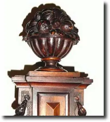 C.1865, Austrian, 2-Weight Vienna Regulator, in early Alt Deutsch style. Although the case has a couple of small moldings missing, this is one of the most interesting cases we have seen in a long while. Note the flying buttress bottom and the built in top with a large carved fruit basket for a finial (definitely been there from the start). There are other nicks and scrapes and the back is slightly bowed, however the original key lock is intact, with key. The Viennese movement is dirty, but well made and intact and original to the case (slide mount). Note hour hand repaired; see unusual Gothic numeral dial. For a collector who likes to work on something well made, this is the ticket. Height 54 inches