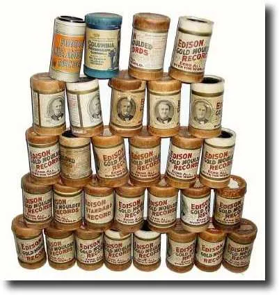C.1905, Mixed lot of Edison Gold Moulded cylinder records. The box contains 28 cylinders (with sleeves and most lids) in very nice condition plus a Columbia record and a Blue Amberol, both in sleeves.