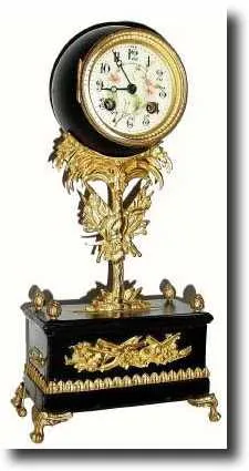 This item is very well made, a delicate pull wind music box in the base, that plays a soft lullaby. The platform movement clock is mounted in a bronze ball that is nestled into a bronze palm tree, on which are hanging regimental flags. The box below has a military frieze of cannon, drums an cannon balls. Seems to have been a gift for a lady who lost someone in battle. The music portion has a few dampers that click, but overall plays nicely. Height 14 inches