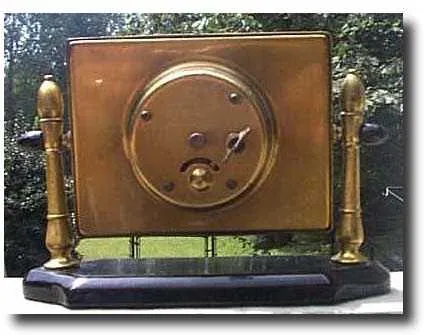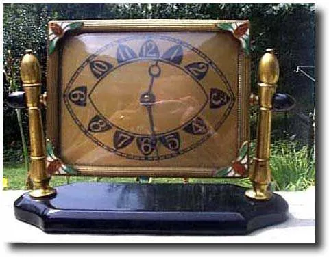 Silvercraft Art Deco Desk Clock vintage desk clock. It is brass with nicely tooled edges and cloisonne corners. The clock swivels from a black Bakelite base. The back is marked 'Silvercraft' with some other symbols that include the British pound sign and the French flor-de-le. The clock measures 4 inches high, 6 inches wide and 2 inches deep. It is in good running order. The overall condition is great with only minor pitting on the columns.