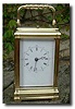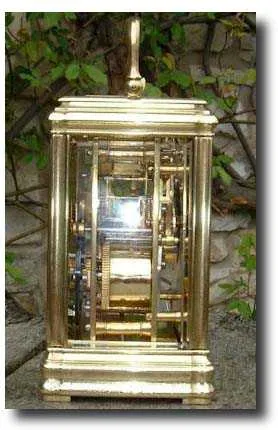 A repeating French carriage clock in a gorge case c1880 A French carriage clock c1890 in a gilt gorge case. The movement strikes the hours and half hours on a gong and repeats the hours. It comes complete with the original Morocco leather travelling case and key.