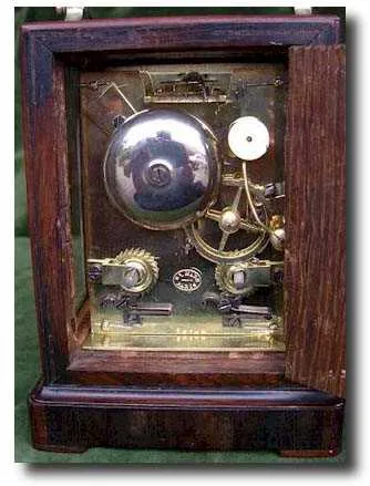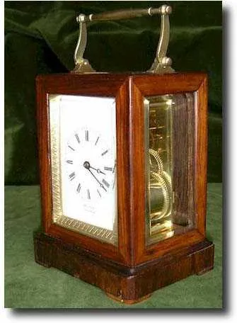 An early French carriage clock in a kingwood and rosewood case c1845 An early French carriage clock in a kingwood and rosewood case c1845, with countwheel strike on a bell. The plinth and backdoor are made of dark rosewood whereas the case is made of the lighter and more marked kingwood. The movement is signed for Hy Marc ý Paris and dates from circa 1845. It is transitional in design. The rear plate has a deep recess made for the early type of platform with a sub-frame divided lift escapement, but is fitted with an early form of mono-metallic escapement which came in around this time.