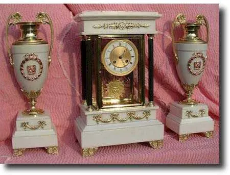 An impressive marble clock garniture dating from c1880 An impressive marble clock garniture dating from circa 1880. The case and urns are made from white Sicilian marble. The fittings and mounts are of very good quality. The movement has been stripped and overhauled.