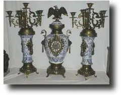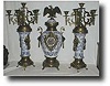 3 Piece China Clock Set , circa late 1800's Case: Delft blue and white China case 27" tall. Works: French good heavy brass with locking plate striking on bell. Condition: Case - Excellent, no cracks or chips; Works - Excellent.