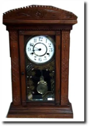 Walnut Victorian Parlor Clock with carvings on the case. It has an eight day brass time and strike movement. Arabic Numeral replaced dial. 17"x 12"x 5...