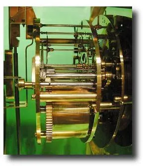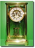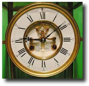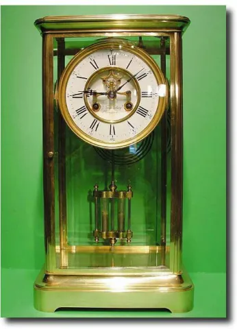 An unusually large French corniche cased brass four glass clock, circa 1870 An unusually large sized French 17" high corniche cased brass four glass clock with red jewelled front visible brocourt escapement and a large mercury pendulum, the large polished fine quality brass corniche case with original thick bevelled glasses with opening front and rear door, the substantial large 14-day duration numbered and stamped movement by "S Marti" with hour and half hour strike on a gong, large mercury pendulum held up by a double screwed back-cock, the two piece white enamel dial with black Roman numerals and seconds division markers, blued steel fleurs de lyse hands, we feel due to the large size of this clock it must have been a special commission for an entrance to a public building or a boardroom clock. 19" x 10" x 8"