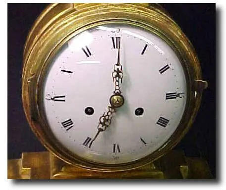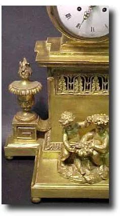 This clock has an exquisite movement which is handmade. It is 8-days duration and strikes on a bell with a lovely tone. The movement design is unusual and of very high quality. It is fitted with a rack striking mechanism of a type similar to Vienna Wall regulators and has static spring barrels. Every piece of the movement shows a fine hand finish - the marking out for the wheels is visible etc. French movements of this age would be count-wheel strike and have rotating barrels) The case is Gesso (wood coated with plaster and then gilded) and the gilding has mellowed to show the red undercoat in places giving the piece a satisfying patina. The dial is enamelled copper and the bezel is cast brass fitted with convex glass.The movement back plate is engraved No. 6 in copper plate hand writing but apart from that there is no mark. The design of the movement however shows that this clock is Austrian. Additional keywords: mantel, mantle