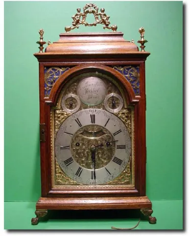 An extremely original well made oak cased original verge escapement Austrian grand sonnerie bracket clock. The very finely foliate engraved dial with Dutch type silvered chapter ring, date aperture and two subsidiary dials with makers name plague signed "Augustin Heckel". The triple fusee Austrian movement of short duration (30-hour) with original verge escapement and fine engraving to backplate. Chiming the hours and quarters on two original nickeled bells rested in the top of the case. 21" x 11" x 6"