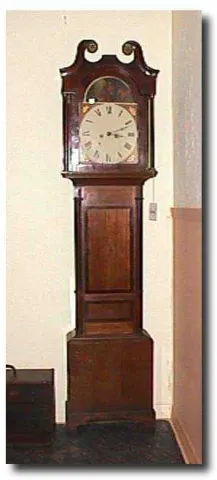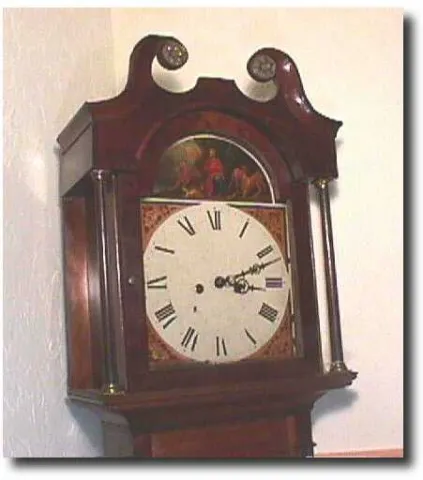 A typical English / Scottish tall case clock with a 13 " hand painted arch dial depicting " David in the Lion's Den " and gilt painted floral at the spandrels. The clock has a mahogany and oak case that with shell inlay and bracket feet. The clock's desirable swans neck scroll pediment has applied brass rosettes at the scroll tips. The 8 day bell strike movement is restored and keeps good time. The dimensions of this clock are 84 " x 21 " x 9 ". Running duration 8 Days