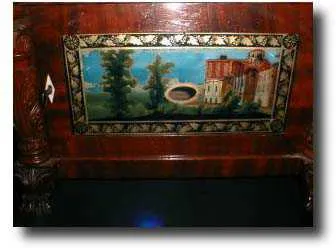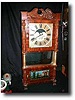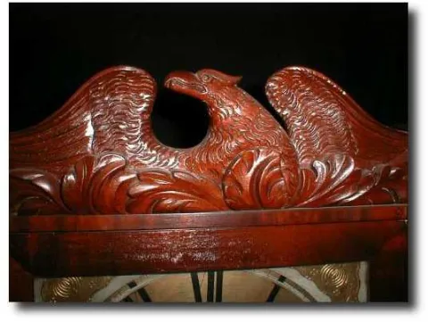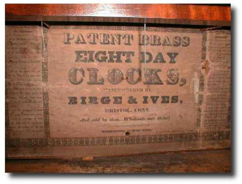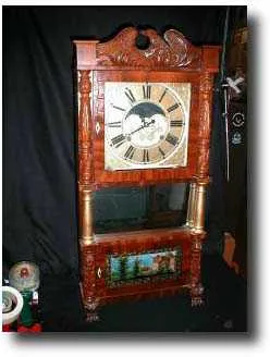 Mahogany case with carved hard wood columns and splat; wood dial with gold gesso on the spandrels and mirror ellipse opening in the upper quadrant of the dial; strap brass movement; cast iron weights. The strap brass movement is typical of Ives work. The movement operates well and strikes perfectly on the hours. It is an eight day clock with the original pendulum bob and crank as well as the original dial mirror with it's wire lift that runs up through the top of the clock and can be used to raise the mirror to view the works inside the clock. 36" tall x 17" wide. Condition: excellent, with minor touch up on reverse painting (eglomise) in lower door glass. Dealer comments: Birge and Ives were only together in business as far as our research can determine from 1832 to 1833. Mr. Birge seemed to acquire partners pretty freely...he was in business with Mr. Peck and Mr. Fuller and several others through the years. This particular duo-Birge and Ives is a wonderful find and the label inside the clock (see photo) is outstanding-MINT!