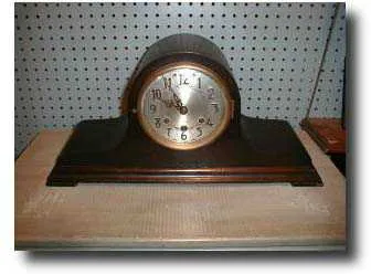 Black Forest Tambour Mantel Clock, Mauthe Clock Co., circa 1930 Dark walnut veneer case with fancy silvered dial and brass eight-day movement in good running condition; Westminster chime on the quarter hour; 20" wide x 10" tall; condition: very good.