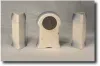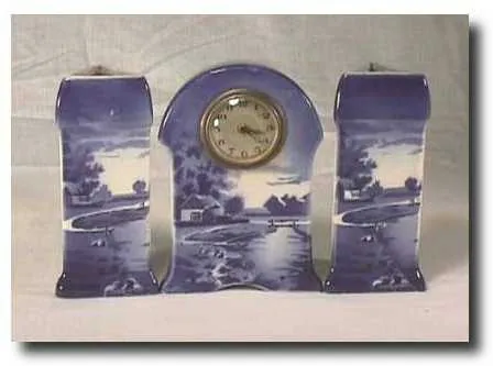 A three piece blue and white china clock set. It has a rear wind with a 30 hour movement. This clock has a silvered dial. There is minor damage on the rear of the case. The dimensions of this clock are7.25 " x 5 " x 2 ". Running duration 30 Hours