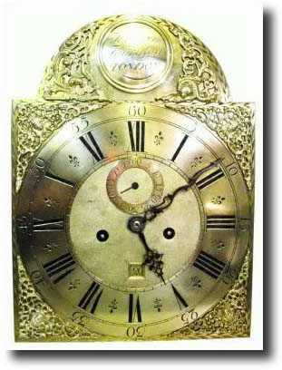 12 inch brass dial, restored, the dial signed Henry Thornton, London. The movement has been bushed and re-strung and is ready for installation. The chapter ring has been polished to brass and should be silvered. Minute hand is an incorrect replacement, but will suffice until you find a proper one. Dial has a matte center with calendar orifice at 6 and the calendar is functioning. With pulleys; without pendulum or weights. Measures 12 x 16 " $400-600