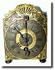 C.1760, Austrian, Miniature Alarm clock, only 5" (13cm) high, by Franz Riess (engraved on chapter ring). Has a 2-day time movement with crown wheel/verge and cow's tail pendulum swinging in front of the dial. The alarm is wound by pulling a cord on the left rear of the clock. Note the alarm barrel is made for a very small chain, and now has a piece of gut in place (OK, but should be changed). The left front bun foot got knocked off and is glued on with hot melt glue (should be soldered). Despite the restorations needed, this is a good 18th century clock that is complete and sound. Height 5" Reserve $2400