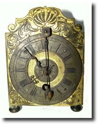 only 5" (13cm) high, by Franz Riess (engraved on chapter ring). Has a 2-day time movement with crown wheel/verge and cow's tail pendulum swinging in front of the dial. The alarm is wound by pulling a cord on the left rear of the clock. Note the alarm barrel is made for a very small chain, and now has a piece of gut in place (OK, but should be changed). The left front bun foot got knocked off and is glued on with hot melt glue (should be soldered). Despite the restorations needed, this is a good 18th century clock that is complete and sound. Height 5" Reserve $2400