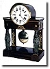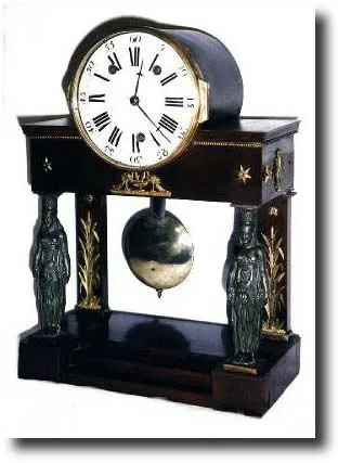 As you might imagine, the Swiss were influenced by both the French and the Austrians in their clock making. This movement is large and round (diam5.5 inches)as the French would make it, but the quarter count wheel and nest of 2 bells is mounted on the back plate, in a similar fashion to some early Austrian movements. The back plate is signed J. P. DuComun. The suspension is silk thread. The pendulum has been replaced, and you might find something more appropriate at a local chapter meeting of NAWCC (note pend length is off a bit as well) The portico style case is supported by wooden pilasters in the rear, faced with gilt reed plants, and the front supported by full bodied Greek maidens with capitals on their heads. Feet and wooden rear dust cover are missing. An interesting 18th Century clock. Height 17" Reserve $500