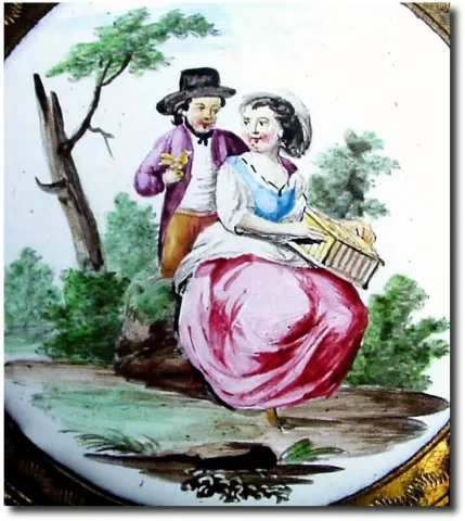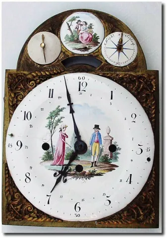 C.1790, Austrian Dial Only, from a Grand Sonnerie bracket clock. Although this dial has been dropped and has a chip near 9, and other scratches, it still retains the original fine hand painting intact. The dial center with a gentleman in nickers and knee socks with top hat, the lady in a pink gown. The small cartouche at top shows a couple in the park with a bird cage, the boy with the yellow bird on his wrist. All 4 heavy cast spandrels intact. Height 10' (25.4cm)