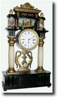 C.1820, Austrian, 3-Train Grand Sonnerie mantel clock, as-found. This clock is generally quite good compared to the previous lot; retains original dial and hands (tip of minute hand broken away); bezel and crystal intact. The only major defect is the pendulum, now an American bob on a wire. The 2 little shadow boxes retain their silk flowers and the center reverse painting of a castle is intact. Dial chips around winding holes. Height 25" $750-1000