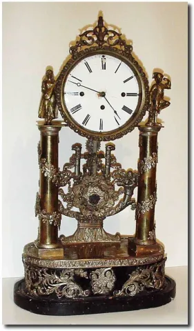 C.1820, Austrian, Grand Sonnerie Mantel clock in a skeletonized motif. The 3 train movement mounted on a platform held aloft by two silvered columns with repousse garlands, and additional floral patterns on the plinth below, and the dial flanked by two bronze statues in native costumes. Retains original floral pendulum (silk thread) made out of the same pressed and silvered brass, and with a painted blossom in the center. The dial has damage and old repairs and will need attention. Tries to run but is filled with dust and in need of thorough cleaning NO DOME, hour hand replaced incorrectly. Lots of potential. Height 18.5'