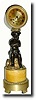 with a very high quality pinwheel movement with silk thread suspension. And with engine turned pattern in both the front and rear bezels. The cherub supporting the clock has his tambourine laying against the stump he is sitting on. The clock and cherub mounted to a cylinder of yellow marble and that in turn to a bronze base with 4 gilded Greek style feet. The dial is signed: Canchy a Paris. Striking the hours and halves on a bell. Height 17 " $3500-4000
