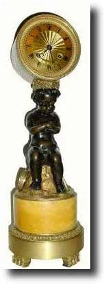 C.1820, French, a Good Period figural clock with a very high quality pinwheel movement with silk thread suspension. And with engine turned pattern in both the front and rear bezels. The cherub supporting the clock has his tambourine laying against the stump he is sitting on. The clock and cherub mounted to a cylinder of yellow marble and that in turn to a bronze base with 4 gilded Greek style feet. The dial is signed: Canchy a Paris. Striking the hours and halves on a bell. Height 17 " $3500-4000
