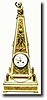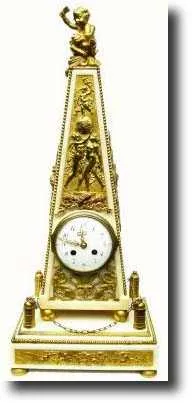 white marble and ormolu, now with a Victorian movement (fits OK). Refer to Tardy's, Part II, page 264, fig 1 for similar clock that is in the Louvre. This form of clock in an obelisk case does not occur that often, and this clock can be enjoyed as-is or you might find a silk thread movement that will fit. Note also interesting cherub on top, holding a hammer and chisel, sculpting a female bust in his lap; sides of the obelisk are decorated as well. Rear two feet of base have been poorly replaced and need attention, otherwise complete and sound. Height 27" $900-1200