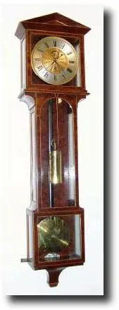 approximately 3-month running time, with restorations. The case has been refinished; a split in the back repaired, one stabilizer missing completely, the other is missing the thumb screw. On the movement, the dial has been refinished, and the original engine turned bezel and center gold plated; the rear bridge has been repositioned once to adjust the verge. The pendulum stick has been replaced, broken again and repaired, 2-piece brass bob with very minor dents, and beat scale missing part of its paint. Clock runs but would benefit from service. On this style case, the hood slides forward and off for service; door to hood swings open to wind; center and bottom panels lift out for set-up and adjustment. In better condition, these bring 25,000. Height 46" Reserve: $11000