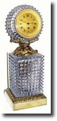C.1830, French, Cut Glass Crystal Clock in very good condition. The well made French verge movement has been purpose made for this case with front wind through the dial. The back plate of the movement is signed Thomas Langlois, a Paris, No. 113. Movement has a well fretted balance cock and a circular silvered scale engraved Retarde/Avance. The delicate cast bezel has a fine engine turned pattern and retains the original gilding. Bottom glass is perfect; top has some tip wear on the under side where the glass bezel mounts to the ormolu throat piece (only visible on close inspection). A great clock for glass collectors; Height 10 inches $2000-2500