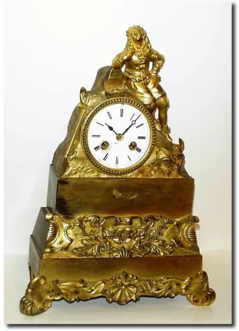 C.1830, French, Ormolu Figural Clock. I don"t recognize the figure, but he/she has an open jewel box in front of him/her, and appears to be looking into a small hand held mirror. To the left is a sword at rest. Below the plain plinth is a cast and gilded floral fantasy, and the very base a fantasy of shells and scrolls. Note this clock was dropped long ago and the left front foot was riveted back on (very old repair). At the same time the dial was cracked and is still in need of attention; dial also worn at winding holes; hands do not match. With an 8-day silk thread mov"t, bearing mark of Nicolas Douillon. No pendulum; no bell; needs work; height 13'