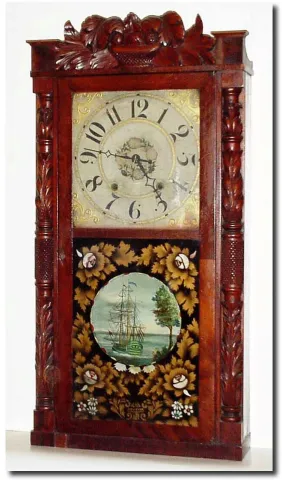 A carved column and splat case (well carved), now with another wooden works movement and dial (dial does not fit winding arbors properly). Tablet is recent; no label; no weights. Still, all of the parts have some value. Height 32'
