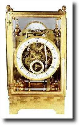 with date and moon phase, and with a repeat button on the left side of the case. This is a very interesting and well made clock, with fusee for the time and a large going barrel for the strike; the wheels are all nicely spoked and the snail is skeletonized. It appears, with a quick count, to run for a week and this is unusual for Austrian mantel clocks of this period (winds from the rear). The brass case is fire-gilt, the base with a mock brick motif, and with 4 little pineapple finials at top. The platform and lever are hand made, commensurate with this period, with an "English flavor" to the construction. One would not expect such heavy beveled glass for the time period, but we see no evidence of it being changed and we have seen early weight movements, encased in heavy beveled glass similar to this. The moon dial has a single hairline across the center. In the end, an uncommon and desirable Austrian clock; Height 13" $10000-12000