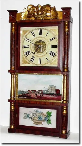 C.1840, Birge, Mallory and Co, Bristol, Triple Decker in good condition. Retains a good label, restored wooden dial (generally good), and signed 8-day strap brass movement, clean and running. Top and bottom glass retain original putty; middle and lower glasses nicely restored, a port scene in the center and a fruit basket at bottom; original gilded splat and shell columns; Height 35.5'